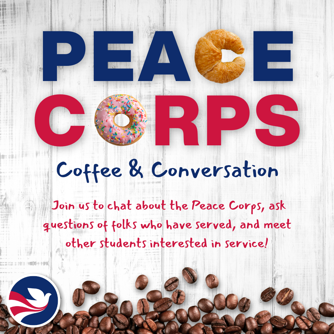 All are welcome to join us to chat about the Peace Corps, ask questions of folks who have served, and meet other students interested in service! We hope to welcome Peace Corps Prep program participants, recent Peace Corps applicants, Returned Peace Corps Volunteers from around campus and the community, and anyone else who is curious!